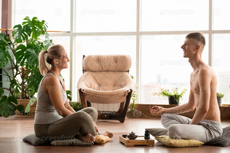 Счастливая молодая активная пара сидит на подушках, расслабляется и пьет травяной чай
