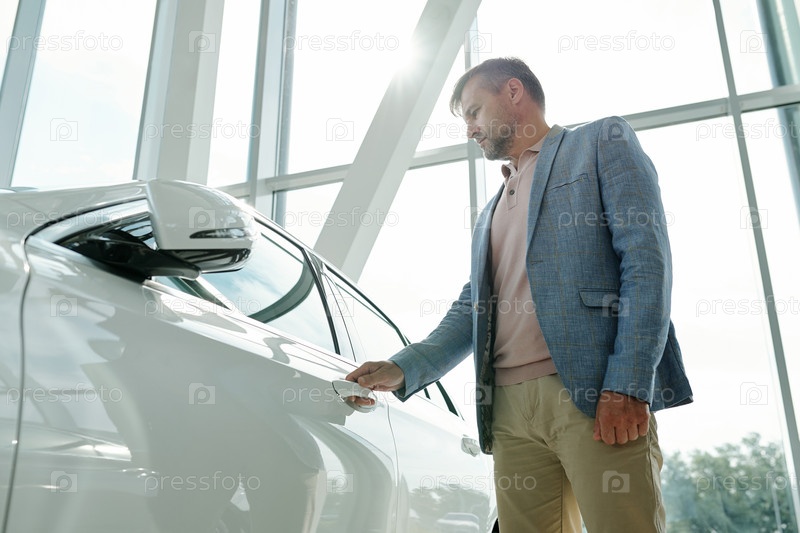 Современный молодой человек в умной повседневной одежде стоит у новой белой машины