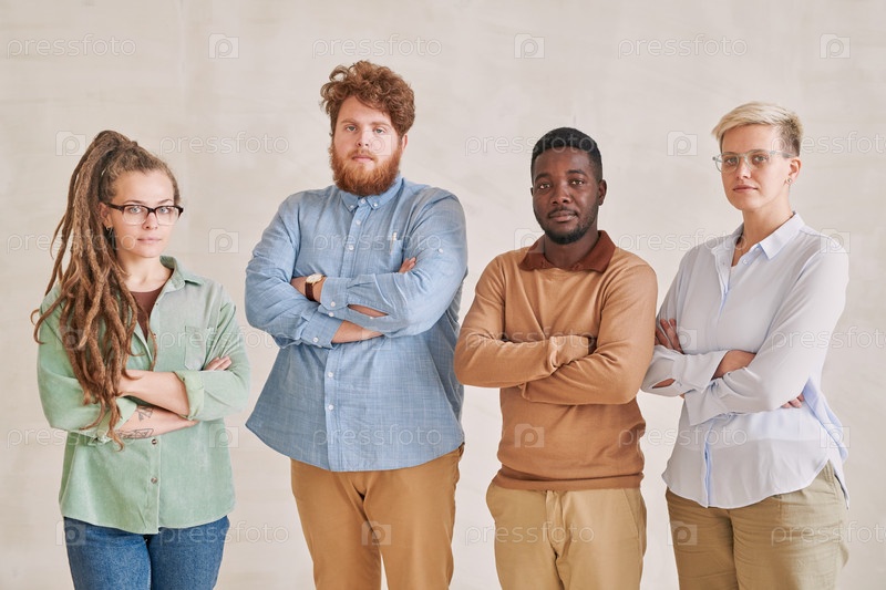 Группа из четырех серьезных молодых мультиэтнических рабочих, стоящих с перекрещенными руками и смотрящих на камеру