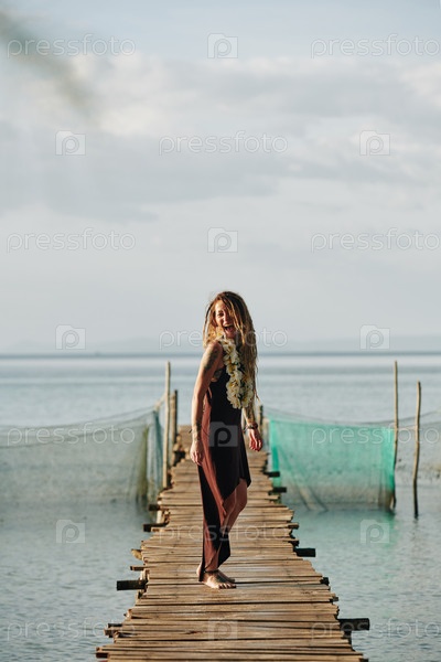 Счастливая женщина на деревянном пирсе