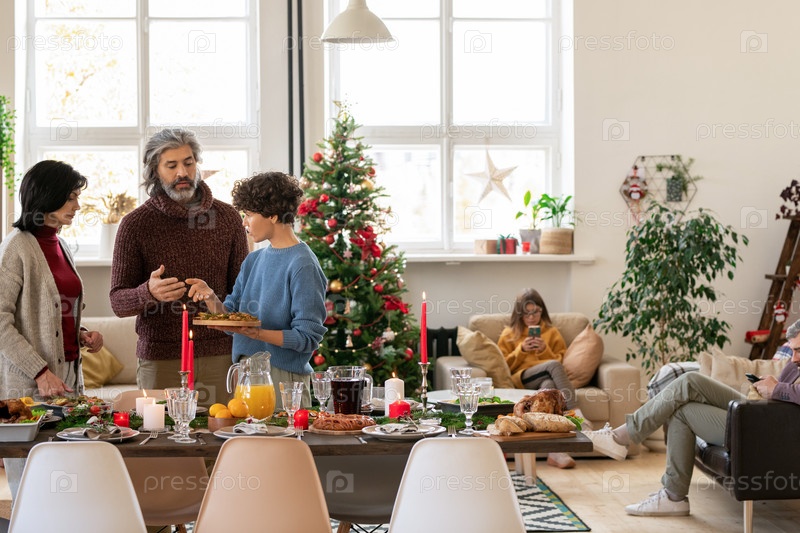 Две женщины и пожилой мужчина решают, куда поставить доску с кусочками жареного картофеля