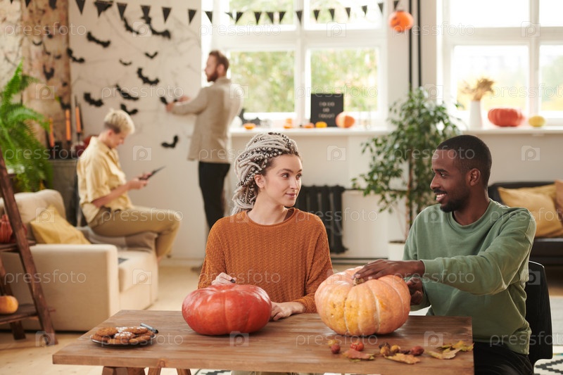 Позитивные молодые мультиэтнические друзья сидят за столом и режут тыквы, готовя украшения на Хэллоуин