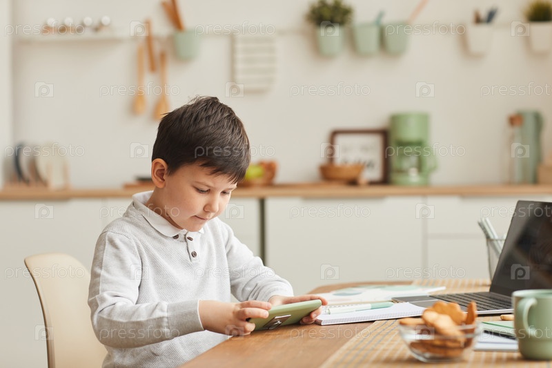 Милый мальчик отвлекается мобильной игрой во время учебы