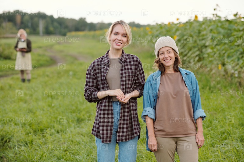 Две веселые фермеры в рабочей одежде смотрят на вас с улыбкой на ферме