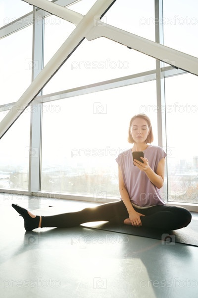 Молодая спортсменка с одной вытянутой ногой сидит на коврике у большого окна