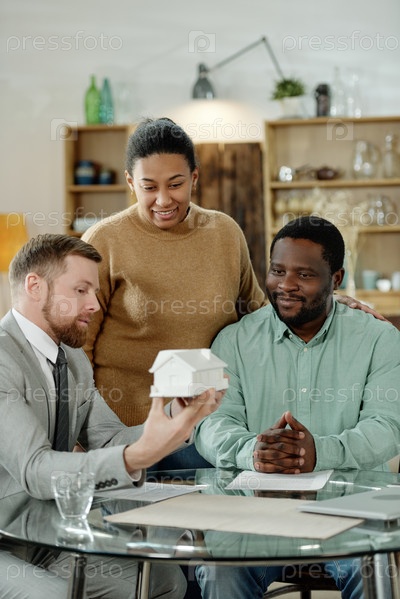Мужчина показывает макет дома клиентам