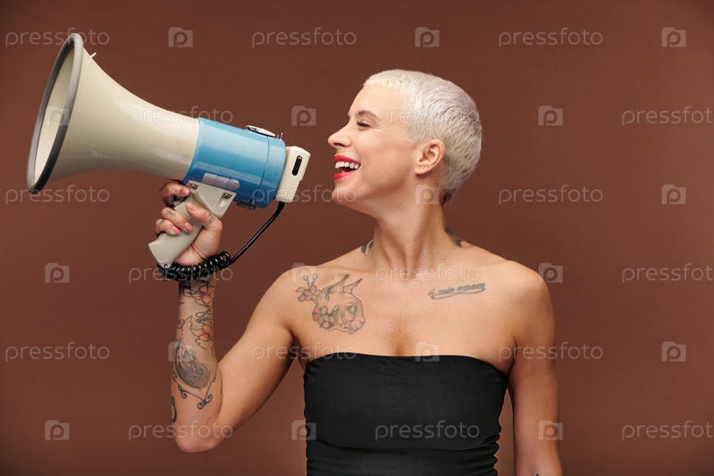 Счастливая молодая блондинка с татуировками на руке, груди и шее, держащая мегафон