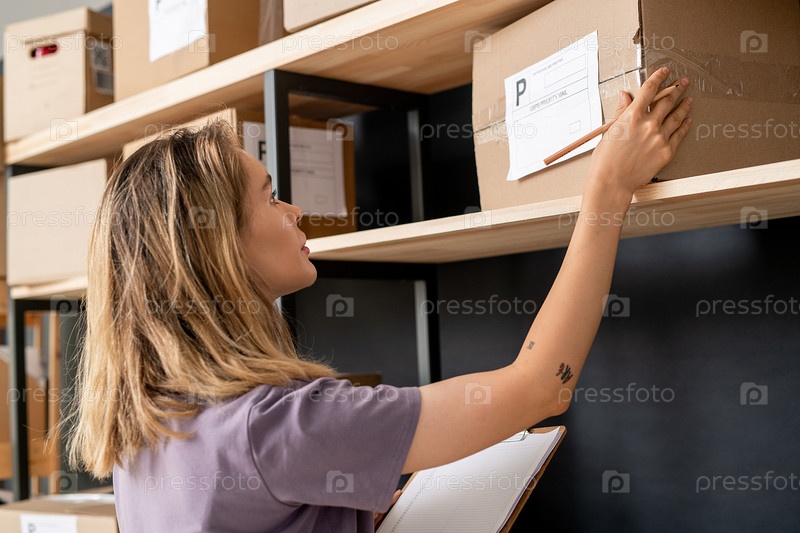 Молодая блондинка со списком заказов и карандашом для проверки адреса получателя