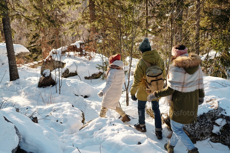 Ряд молодых друзей в зимней одежде, движущихся вперед в снежном дрейфе среди деревьев
