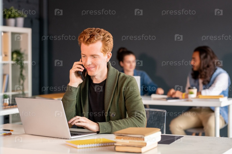 Молодой улыбающийся офисный менеджер-мужчина со смартфоном смотрит на дисплей ноутбука