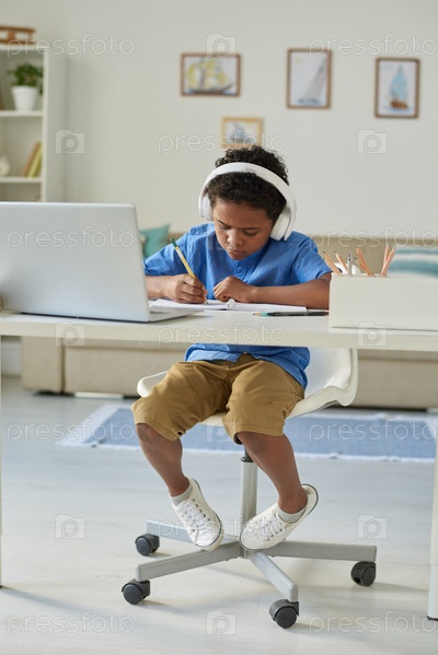 Концентрированный чернокожий мальчик в наушниках сидит за столом и делает домашнее задание с онлайн-репетитором