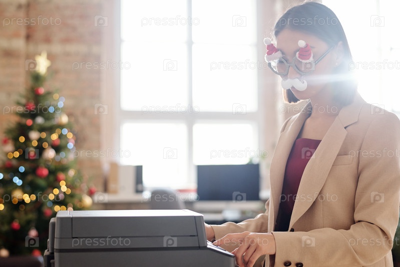 Женщина-офисник в рождественских очках с белыми усами, использующая ксерокопирующую машину