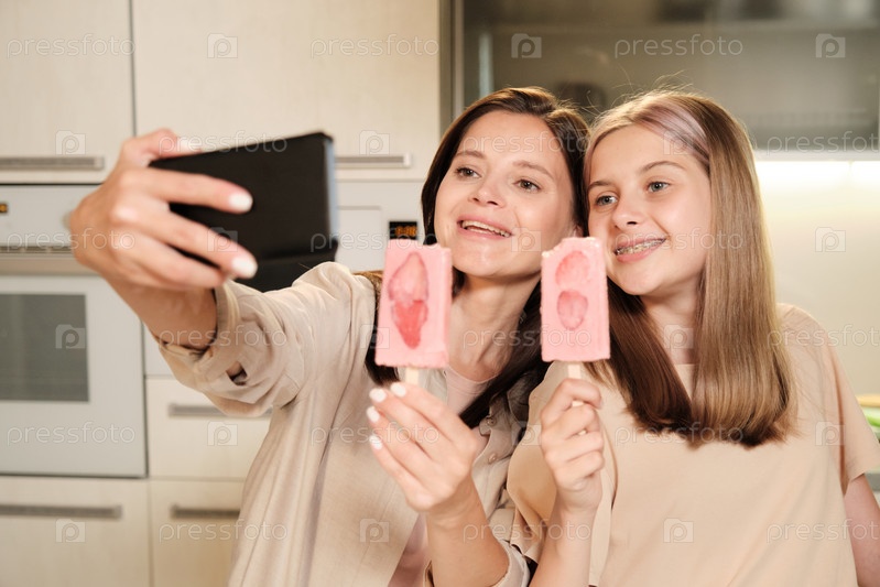 Две молодые веселые женщины с домашним мороженым делают селфи на кухне
