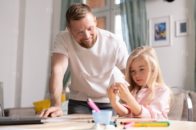 Милая девочка смотрит на бумажную игрушку в руках, сидя за столом