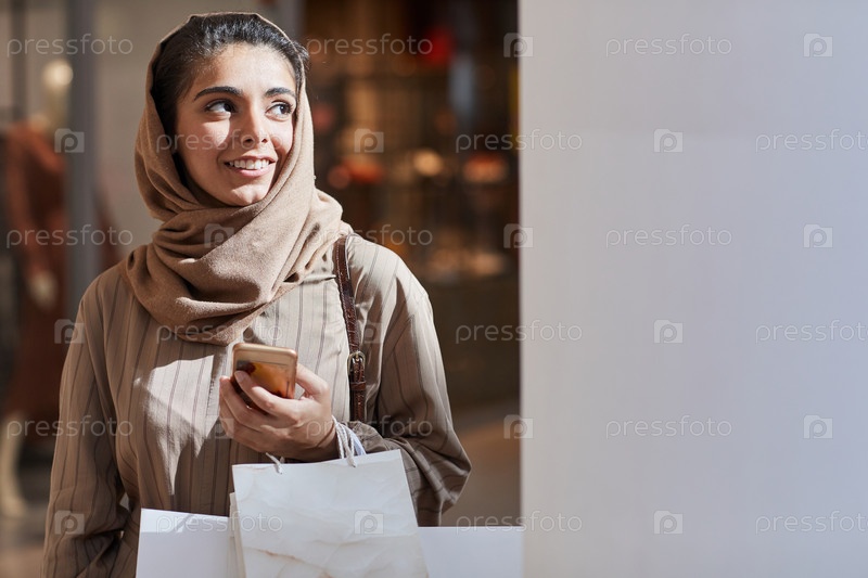 Улыбающаяся ближневосточная женщина покупает в торговом центре