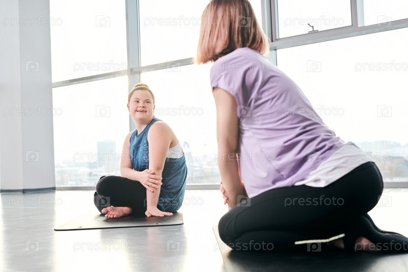 Счастливая девочка-инвалид в спортивной одежде смотрит на друга, пока оба сидят на ковриках