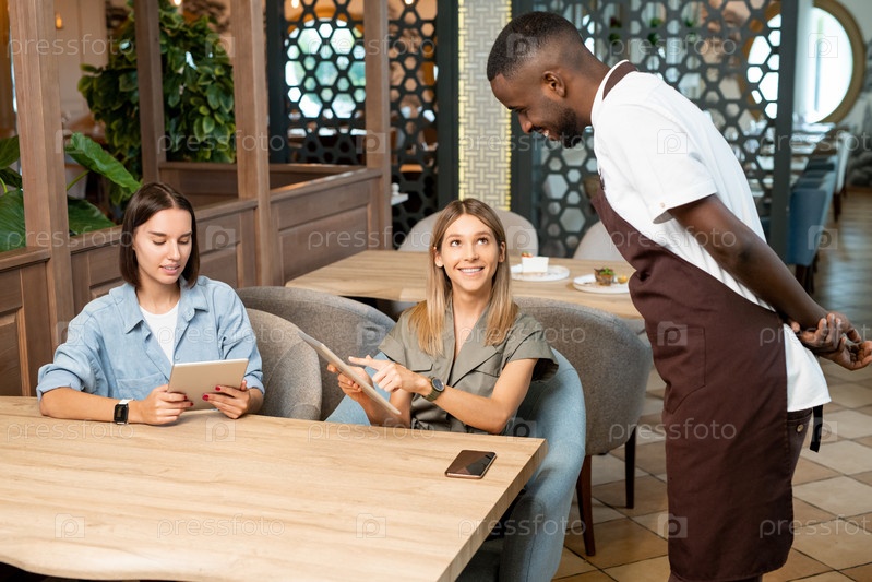 Молодой улыбающийся официант в форме наклоняется над столом и смотрит онлайн меню