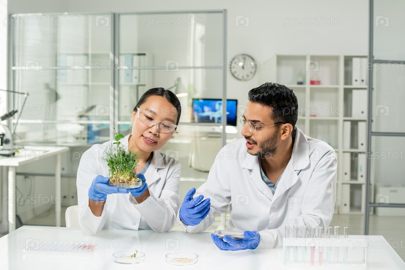 Молодая исследовательница в перчатках и белом халате, держащая выращенные в лаборатории соевые побеги