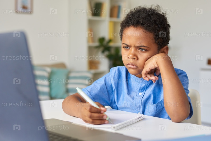Бросающий на лицо афроамериканский мальчик с кудрявыми волосами сидит за столом и делает записи в учебнике, думая об объяснениях учителя во время онлайн-урока