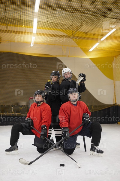 Женская хоккейная команда позирует на льду