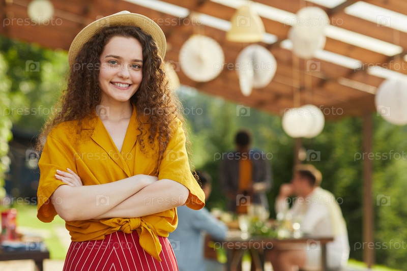 Улыбающаяся молодая женщина позирует на открытой летней вечеринке