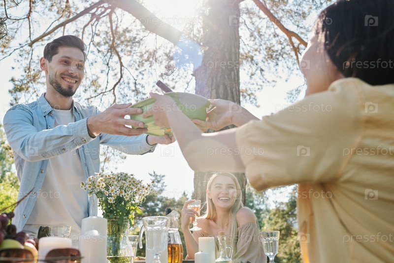 Счастливый молодой человек с зубчатой улыбкой пропускает миску с вареным овощем