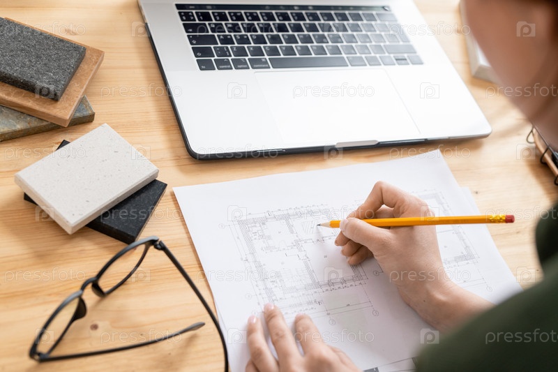 Рука молодой архитекторницы с карандашом над планом нового дома