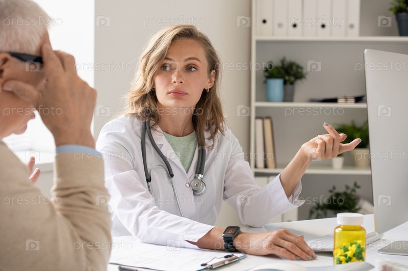 Молодая уверенная в себе врач показывает на компьютерный экран во время консультации с пациентом