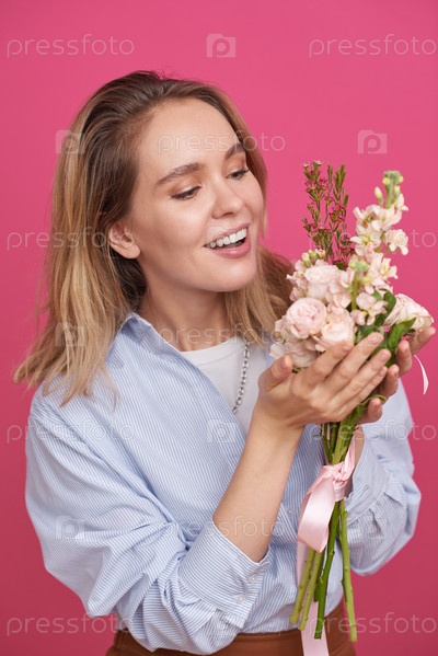 Вертикальный средний портрет привлекательной молодой женщины, стоящей на розовом фоне стены и держащей красивый букет цветов