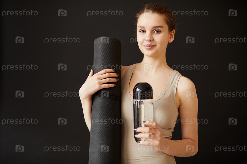 Женщина с тренажерным ковриком и водой
