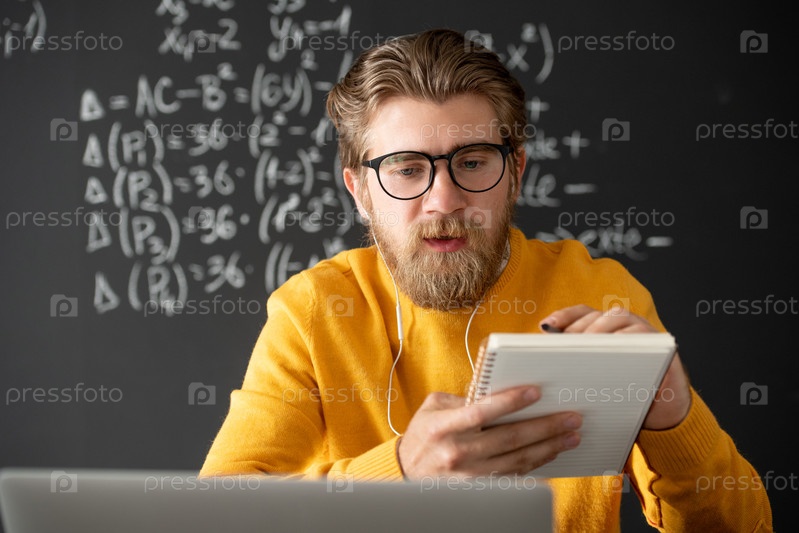 Молодой бородатый учитель в очках слушает одного из онлайн-студентов