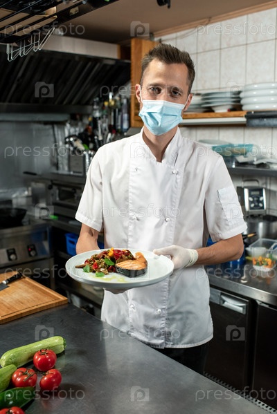 Мужской шеф-повар держит жареного лосося с вареными овощами над кухонным столом