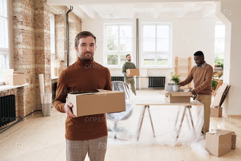 Портрет содержания Красивый молодой менеджер в гардеробе держит закрытую коробку с вещами против коллег, устанавливающих новый офис
