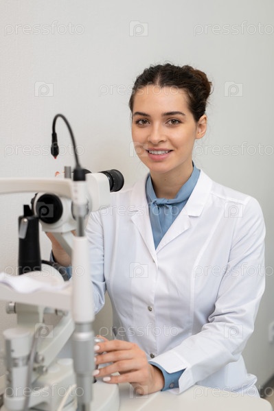 Молодой веселый брюнетка женский офтальмолог в белом халате ждет пациента