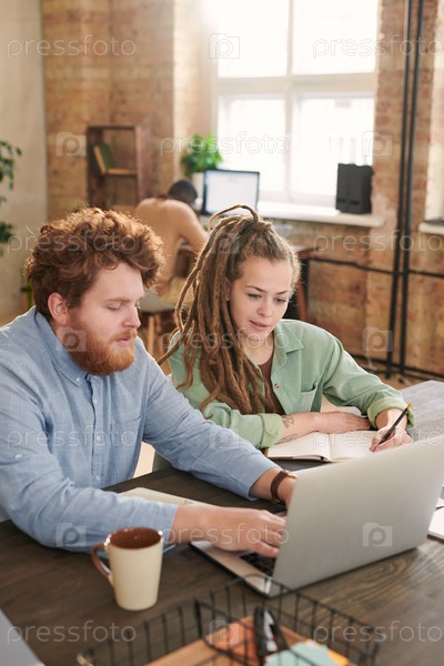 Загруженный молодой рыжебрасый мужчина печатает на ноутбуке, готовя отчет с коллегой в коворкинге