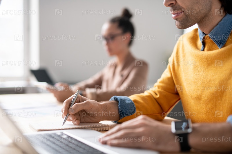 Загруженный молодой менеджер с ручкой на странице блокнота собирается записать свои идеи