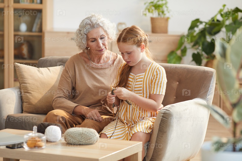 Милая девочка учится вязать с бабушкой