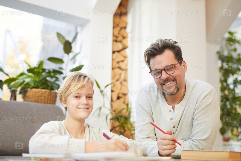 Улыбающийся отец помогает сыну с домашними заданиями