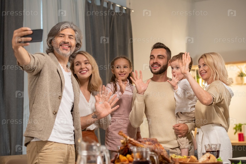 Веселый зрелый мужчина со смартфоном делает селфи со своей семьей за столом