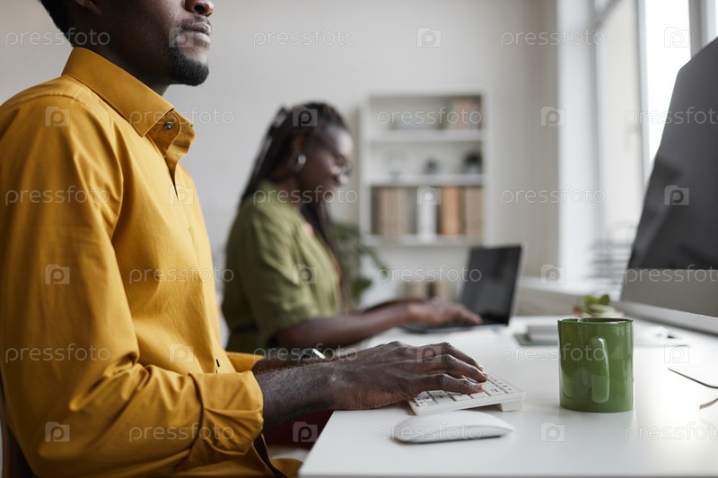 Афроамериканский мужчина, использующий компьютер в офисе Close Up