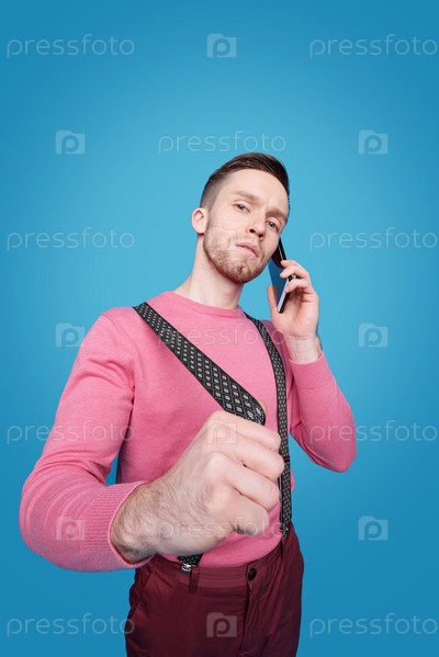Уверенный в себе молодой бизнесмен со смартфоном, растягивающим подвеску
