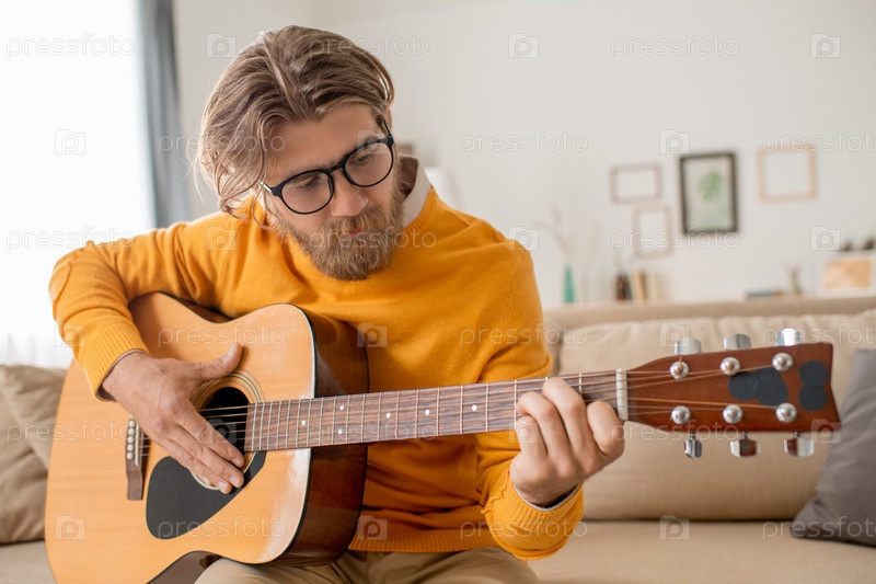 Современный молодой человек в джинсах и желтом свитере тянет за струны гитары