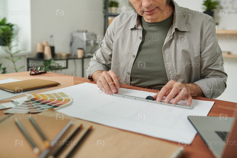 Ближайший снимок дизайнера, сидящего за столом и регулирующего линейку во время работы над эскизным планом