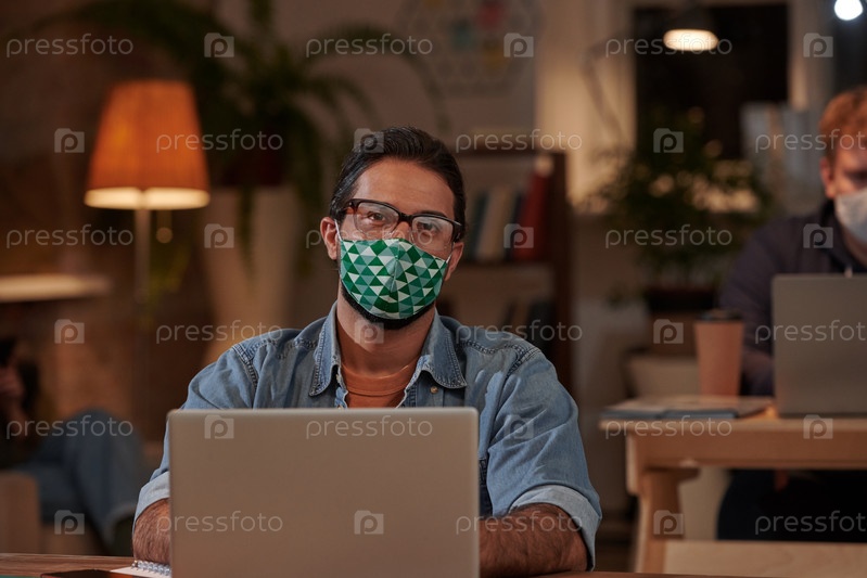 Бизнесмен в маске использует ноутбук