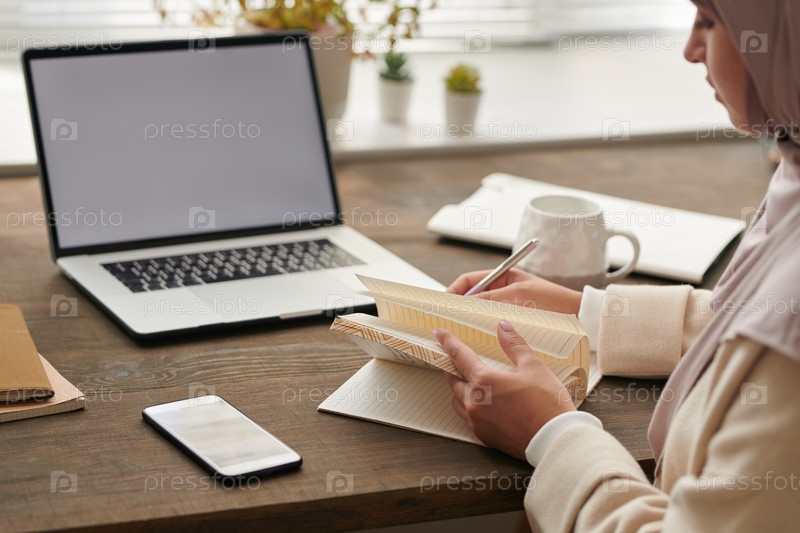 Непризнанная мусульманская бизнесвуменка сидит за столом перед своим ноутбуком, планирует свою работу и делает записи в блокноте