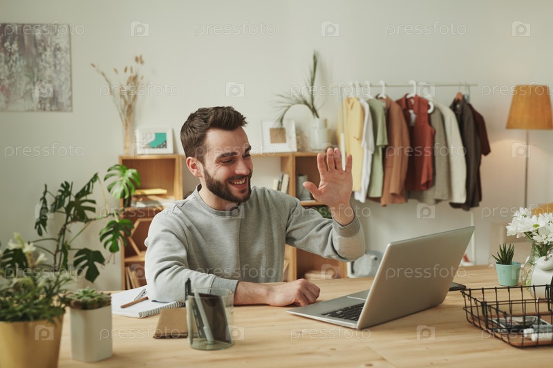 Веселый молодой дружелюбный мужчина машет рукой, разговаривая через видеочат