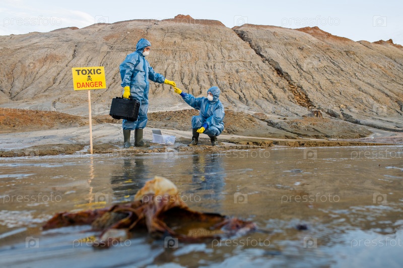 Эколог передает образец токсичной воды или почвы коллеге во время исследования