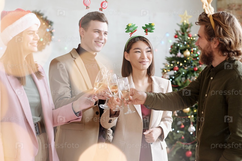 Веселые молодые коллеги в рождественских головных повязках выпивают тост за Рождество