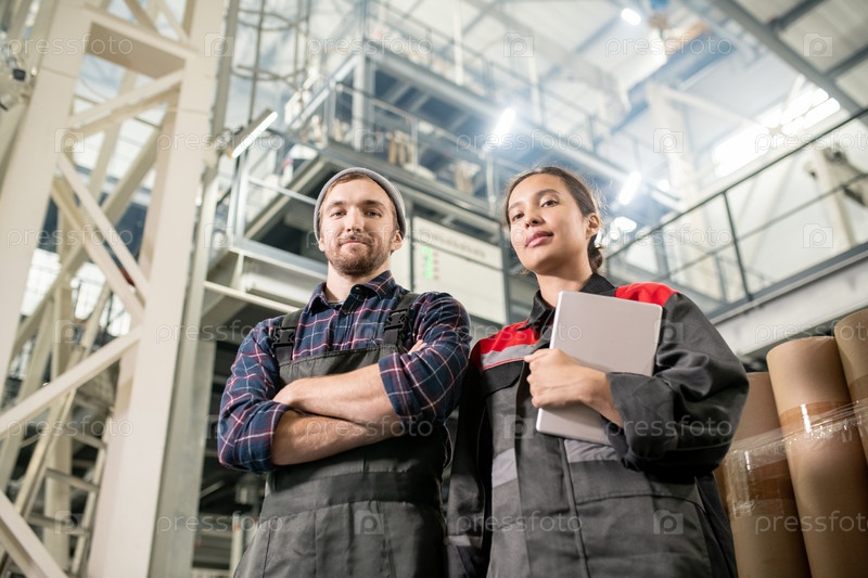 Молодые успешные инженеры-мужчины и женщины крупного завода смотрят на вас