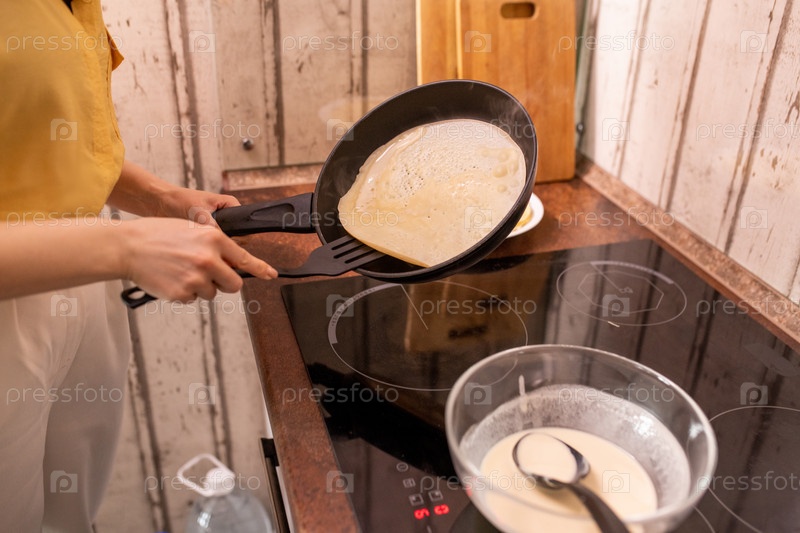 Молодая домохозяйка со сковородкой над электрической печью, готовящая на кухне